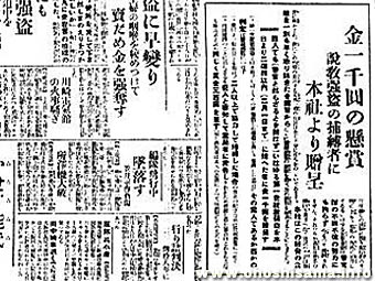 東京朝日新聞では、大正15年頃から続発している説教強盗》を捕まえた者に1000円の賞金を出すと記事を掲載します。