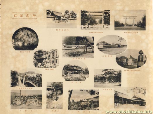 表紙には、《京都観光 京都名所遊覧乗合自動車株式会社 寫眞部》の印と、乗合自動車の刻印がなされています。 中には鳥居の前での記念写真が貼ってありますが、鳥居は《○国大明神》とも読めます。 内側には京都名所や舞妓さんなどの写真が並んでいますが、写真に写っているお茶の師匠さんやお弟子さんたちで、比叡山や京都見物をしていたのでしょうか?