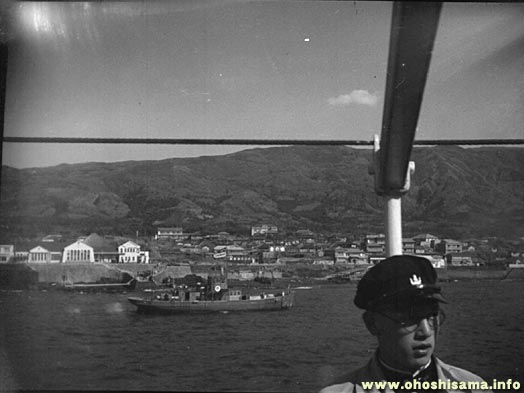 | 上はどこかの港のようですが、写っている学帽のマークで、東京外国語学校時代ということは判っていました。 後ろは港のように見え、船も見えますが、軍の船ではなさそうです。 また街には「カルピス」や「味の素」といった看板も見えますので、軍港でもなさそうです。
